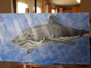 Hope everyone had a great Easter weekend. Mine was busy and fun filled. I did manage to get some great painting time in. sometimes I can just bang the paintings out whereas other times they are slow moving coming out of my hand. This weekend I painted my first shark, what you do for your kids lol  I also finished one painting for an up and coming show at the WAAC themes “Spring into Green”  You can find details of all events going on a t the Womens Art Association  on their website. http://www.womensartofcanada.ca/